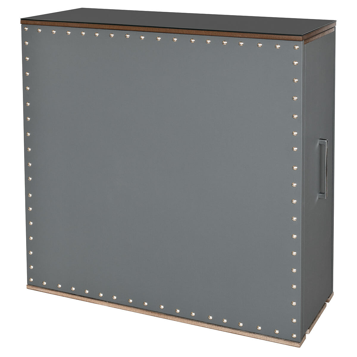 The Alabama Grey Breakfast Bar is a modern and attractive furniture piece designed to enhance your dining area. With its sleek grey finish, black glass top, and chrome studs, it exudes a contemporary aesthetic that effortlessly complements various interior styles.