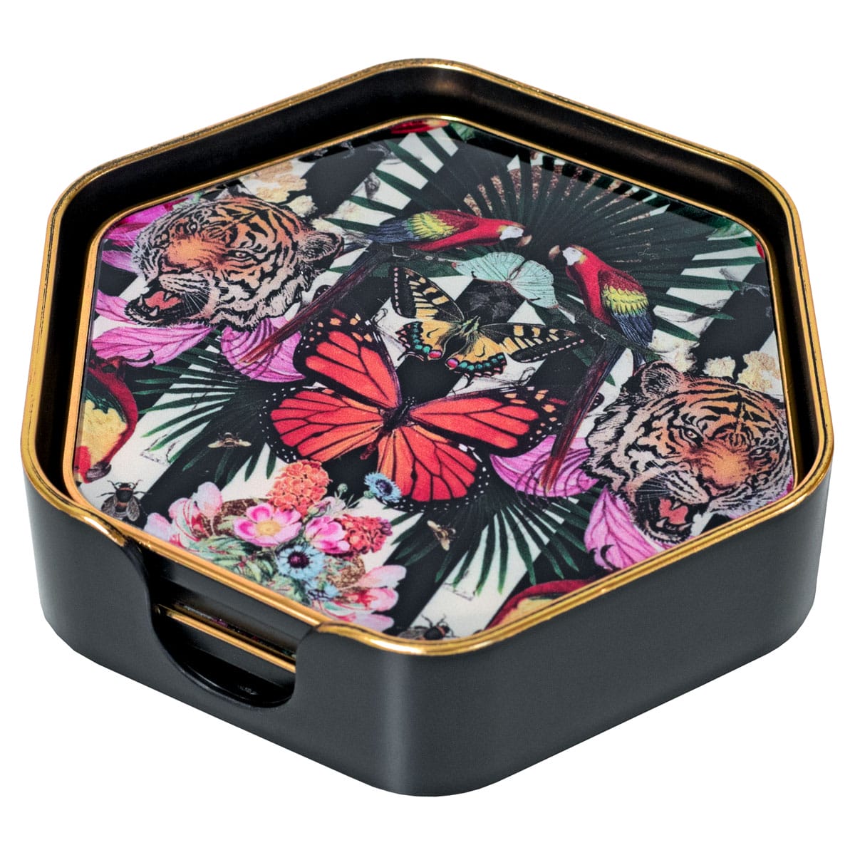 A hexagonal black and gold set of four coasters with a Myrtle and Mary Paradise Lost design, part of our Myrtle and Mary collection of trays and coasters.