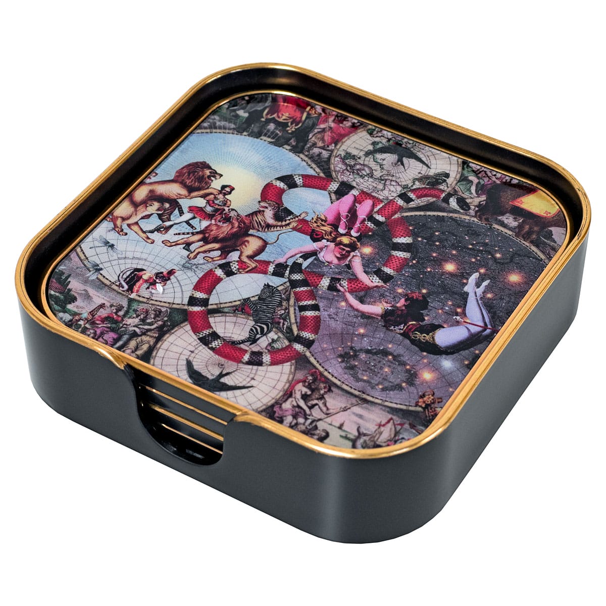 A set of 4 square black and gold coasters with a Myrtle and Mary Le Cirque Du Monde design, part of our Myrtle and Mary collection of trays and coasters.