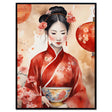 Infuse your space with the delicate beauty of "Blossom Grace," a stunning portrayal of elegance and tradition. This watercolor-style artwork features a serene figure adorned in a flowing red robe, surrounded by soft cherry blossoms and radiant lanterns. The composition captures the essence of poise, beauty, and cultural richness.