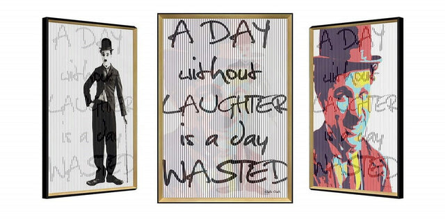 Chaplin as you’ve never seen him before. It has three images for you to enjoy. One image shows him with his bowler hat, walking stick and splayed feet. The next has a famous quote from him: “A day without laughter is a day wasted”. The third has a Warhol-inspired image with pop art colours.