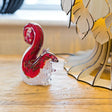 This colourful glass ornament depicts a red and white squirrel with a big curly tail and covered with gold features along the back and tail. The flowing shape and choice of colours are a stunning example of blown glass craftsmanship at its best.