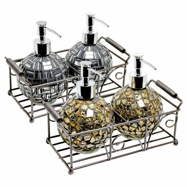 The mosaic glass round soap/lotion dispensers makes a fantastic addition to your modern bathroom, with two new funky colours to choose from displayed in a decorative metal basket