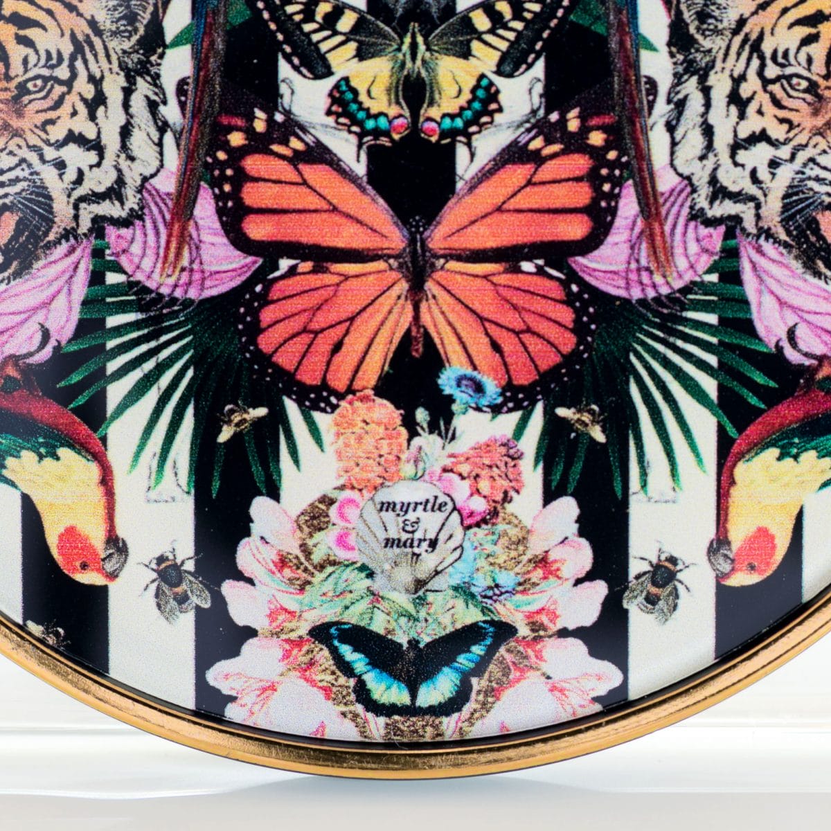 A set of 4 circular black and gold coasters with a Myrtle and Mary Paradise Lost Stripe design, part of our Myrtle and Mary collection of trays and coasters.