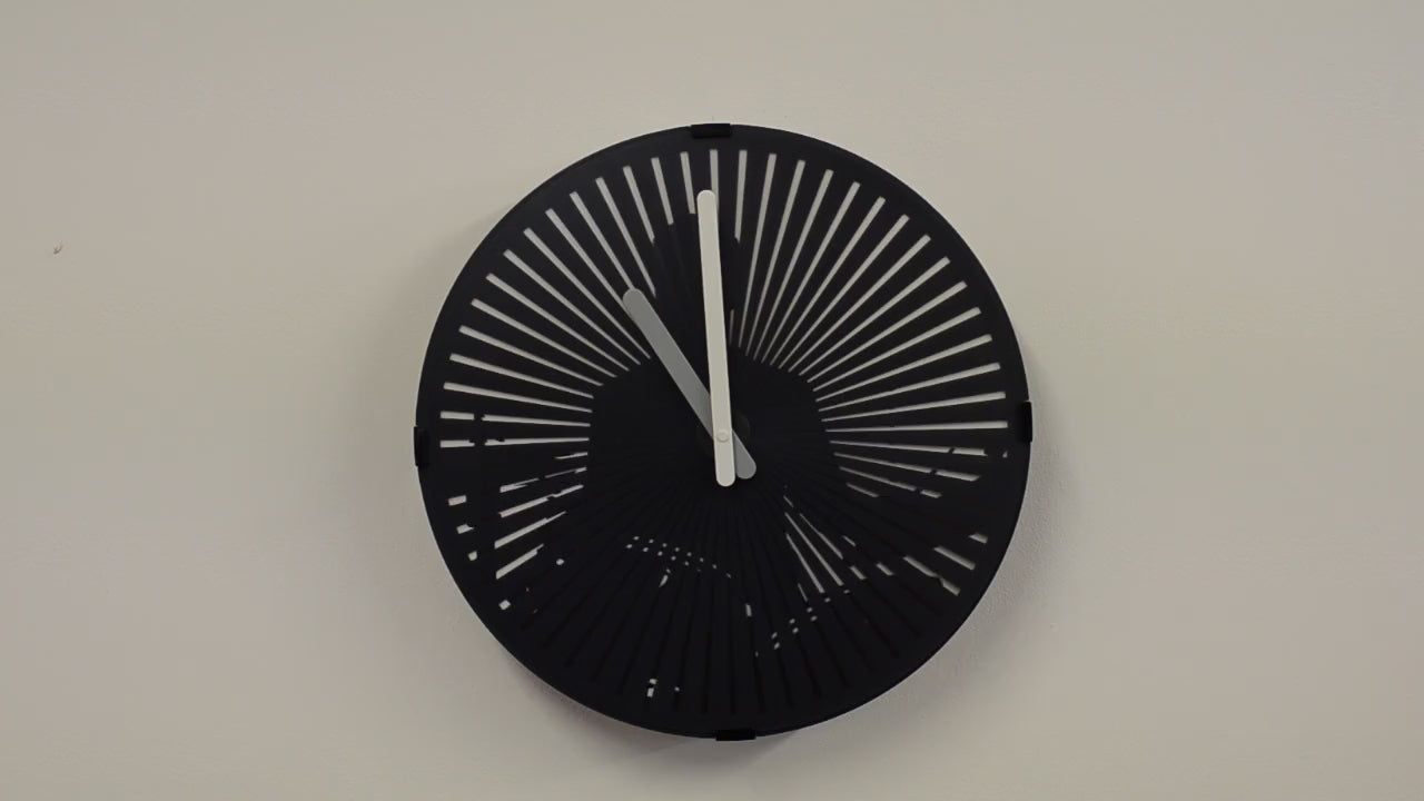 An animated battery-powered wall clock with the silhouette of a man playing the drums that plays a drumming sound every hour.