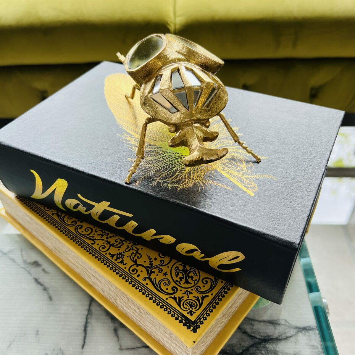 This delightful representation of a Rhino Beetle is beautifully finished in gold leaf and mirror panel detailing. Measuring 20cm long with a fair weight ensuring it's stature and prominence wherever you wish to place it. A great interior accessory sure to add style and individuality to your home.