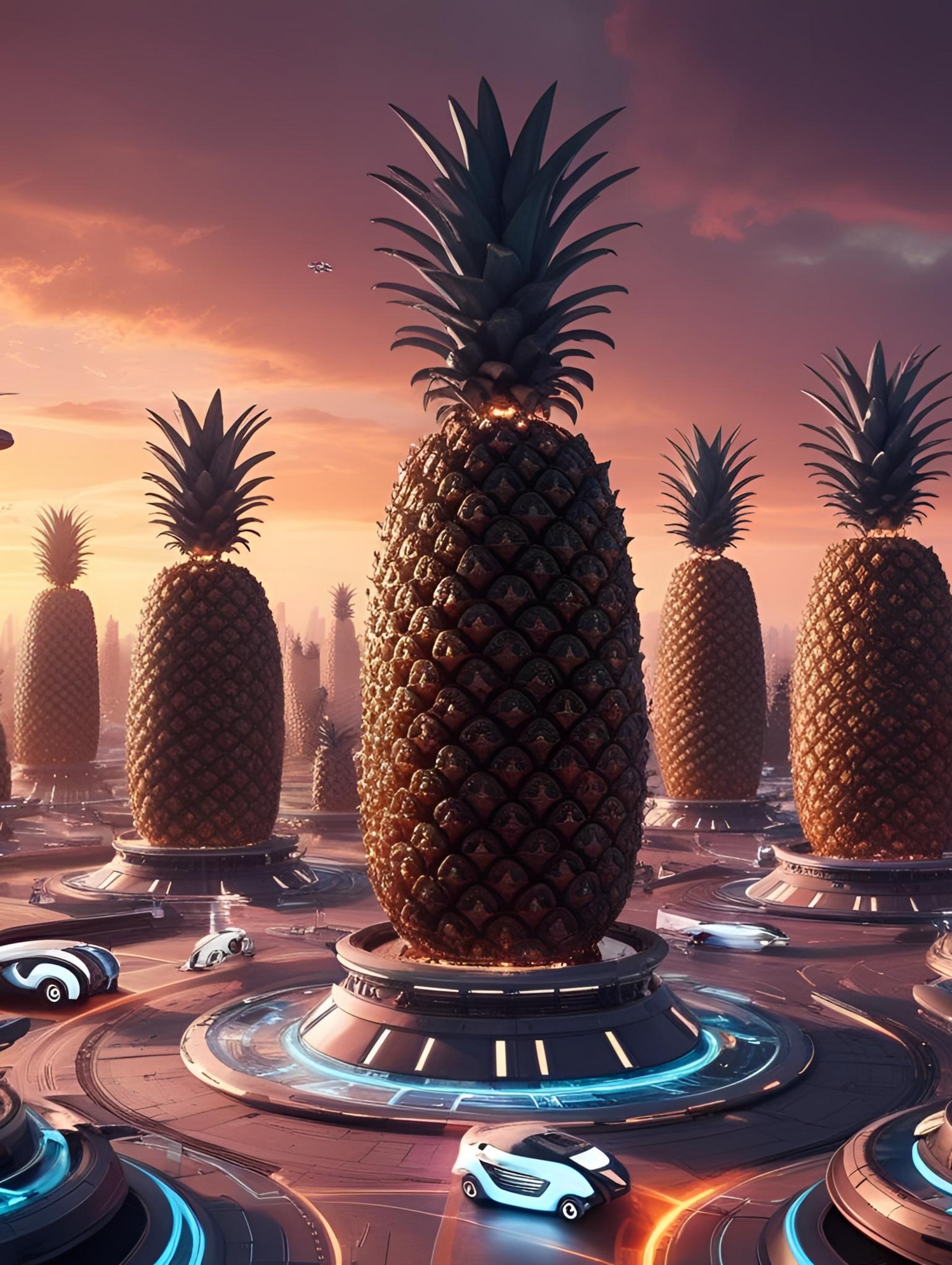 Set in a glowing sunset city, towering pineapples rise from technological platforms while sleek white hovercars zip around them. It’s a world where nature and technology have merged into one harmonious, hypermodern utopia — or perhaps dystopia — depending on your perspective. Light bounces off the pineapples’ golden scales and reflects in the chrome of the vehicles, creating a luminous, cinematic experience.