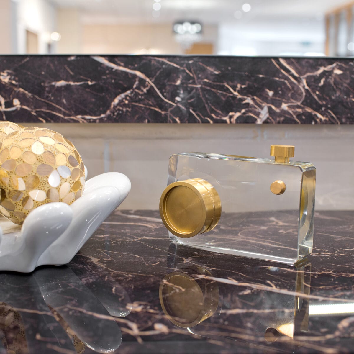 The camera's crystal glass construction imparts a sense of transparency and clarity, offering a delicate contrast to the brushed gold metal lenses and buttons that evoke a vintage aesthetic. The detailed craftsmanship in recreating the camera's design enhances its authenticity.