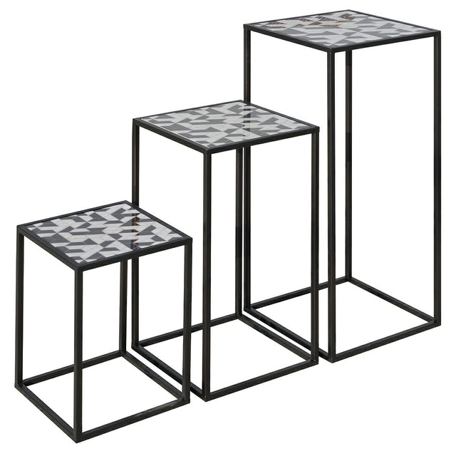 A simple nest of three tall tables with a stylish geometric pattern on the top. An affordable alternative thats easy to store and easy to manage.